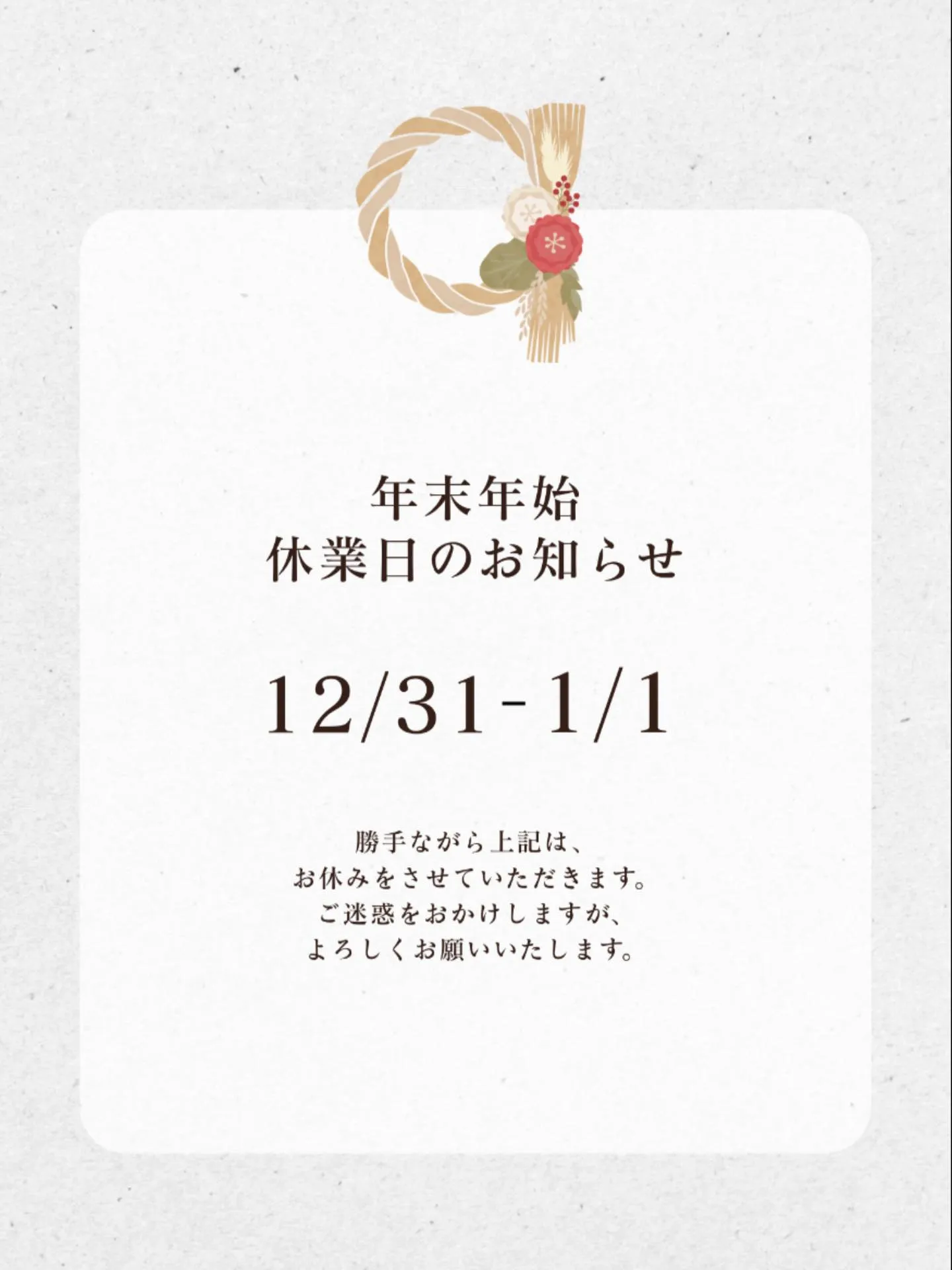 12月31日と1月1日はお正月休みとさせていただきます。 1月2日から通常営業いたします!